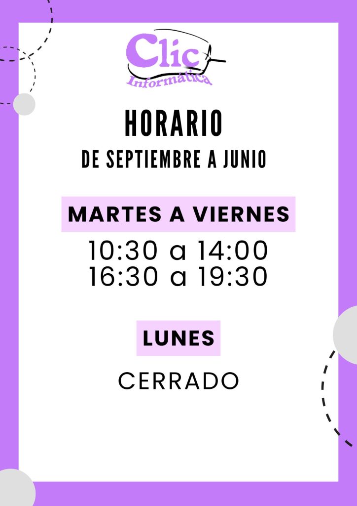 ¡Bienvenido a Clic Informática! 🔧 Reparación y Venta de Equipos Mantenimiento y reparación de ordenadores.Venta de equipos informáticos a medida. ☁️ Copias de Seguridad en la Nube Soluciones de backup automáticas y seguras.¡Nos encargamos de todo por ti! 🛡️ Seguridad Informática Distribuidores oficiales de NOD32 Antivirus. 🌐 Redes a Medida Instalación de redes WiFi y cableadas para hogar o empresa.Configuración de nubes privadas con Hornetdriver desde 100Gb. 📸 Fotografía al Instante Fotos de carnet al momento.Revelado digital de fotografías. 🧾 Gestión Empresarial Facturación, contabilidad y más con Gotelgest.Programas de TPV para bares, restaurantes y comercios. 💻 Servidores Virtuales Infraestructura fiable y escalable adaptada a tus necesidades.